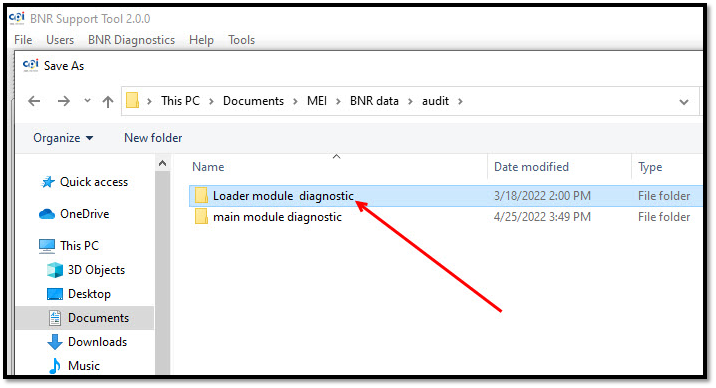 En su PC localice y vaya abriendo los folder: Documents,MEI,bnr data, Audit hasta encontrar el Folder loader diagnostic
