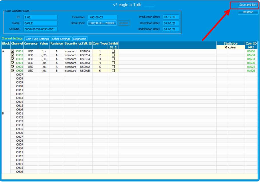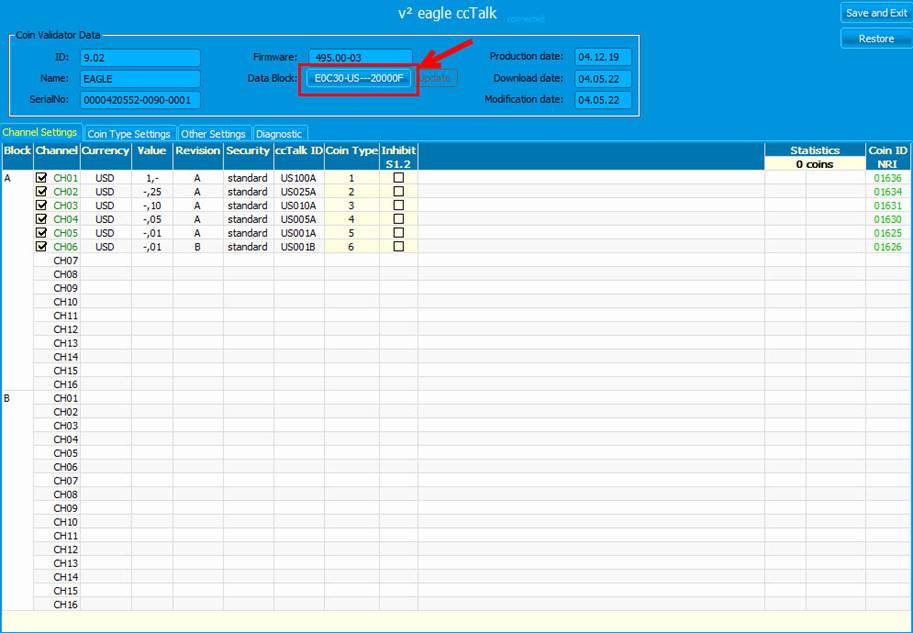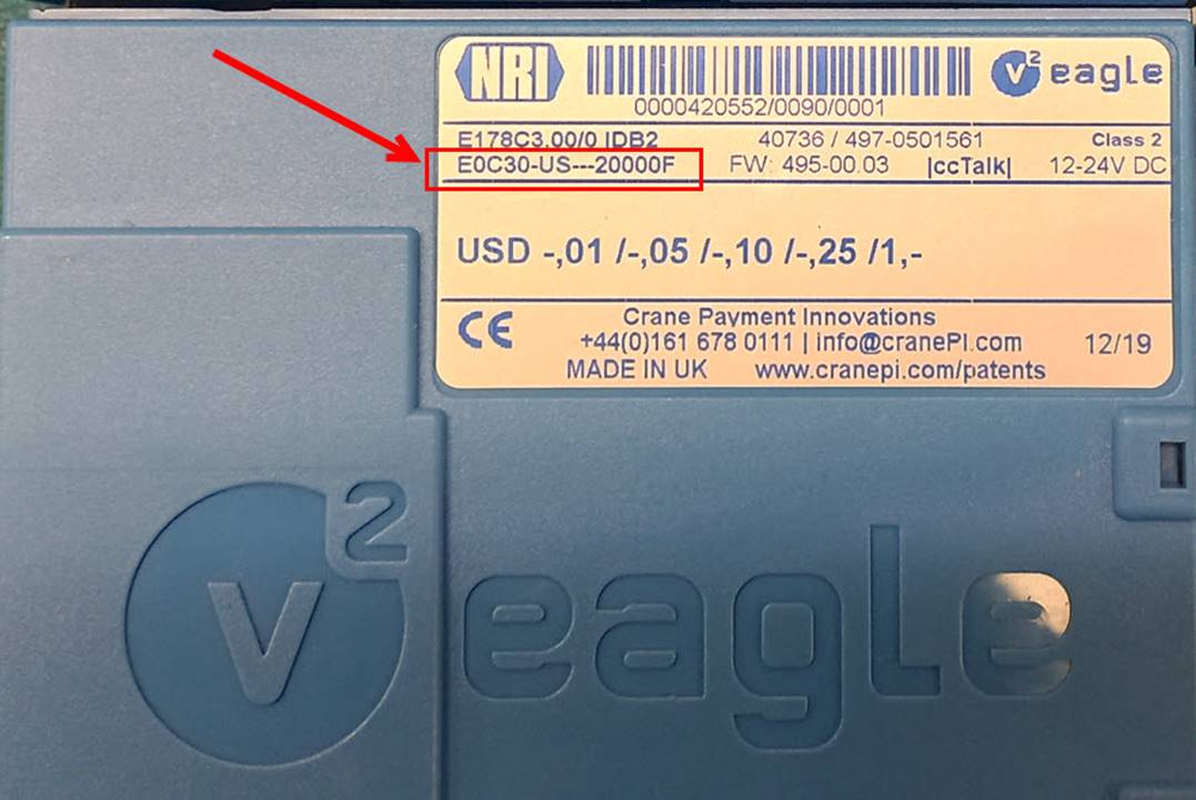 label of the coin acceptor (Eagle) to know what configuration it has and that